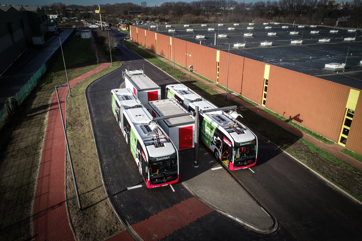 Wenn währen des Linienbetriebs Zwischenladungen nötig sind, ist außerhalb der Busaufstellhalle ein T-Mast mit zwei Schnellladern an den Armen installiert worden. Hier können zwei Omnibusse über ausfahrbare Stromabnehmer, sogenannte Pantographen, mit maximal 300 kW Leistung geladen werden.