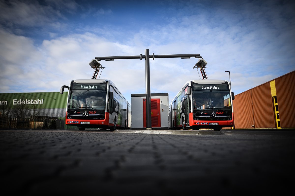 Seit dem 1. März 2022 gehen wir einen weiteren Schritt hin zu einem emissionsarmen Öffentlichen Personennahverkehr: Mit sieben von Land und Bund geförderte Elektro-Gelenkbusse betreiben wir die Buslinie 934 batterieelektrisch. Die Gelenk-Elektrobusse des Typs eCitaro G wurden von der Daimler-Tochter EvoBus GmbH geliefert und verfügen über eine ausgesuchte Technik: Zehn leistungsfähige Hochvolt-Batteriebaugruppen mit einer Gesamt-kapazität von 330 kWh sorgen für eine angemessene Reichweite.
