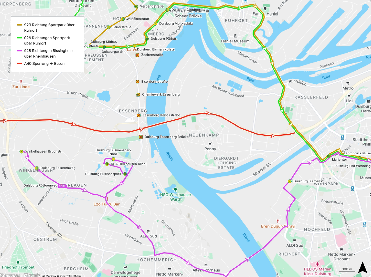 In Richtung Bissingheim fahren die Busse zwischen den Haltestellen „Businesspark“ und „Marientor“ eine örtliche Umleitung. Ab da gilt wieder der normale Linienweg.