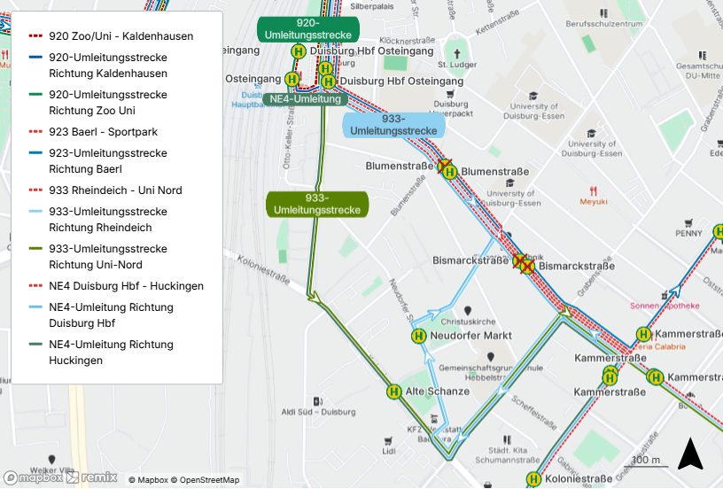 In beiden Fahrtrichtungen fahren die Linien 920, 933 und NE4 zwischen den Haltestellen „Duisburg Hauptbahnhof Osteingang“ und „Kammerstraße“ eine Umleitung.