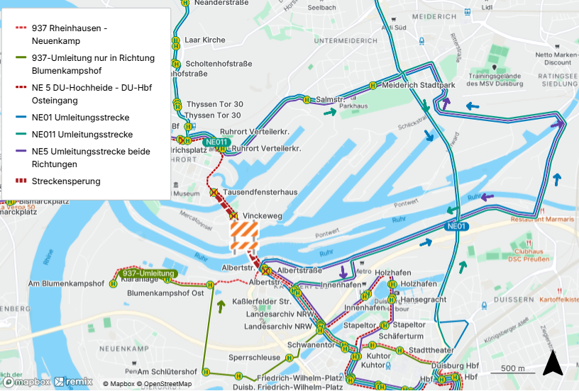 Bitte nutze stattdessen die Haltestellen „Ruhrort Bahnhof“ oder „Eisenbahnstraße“.