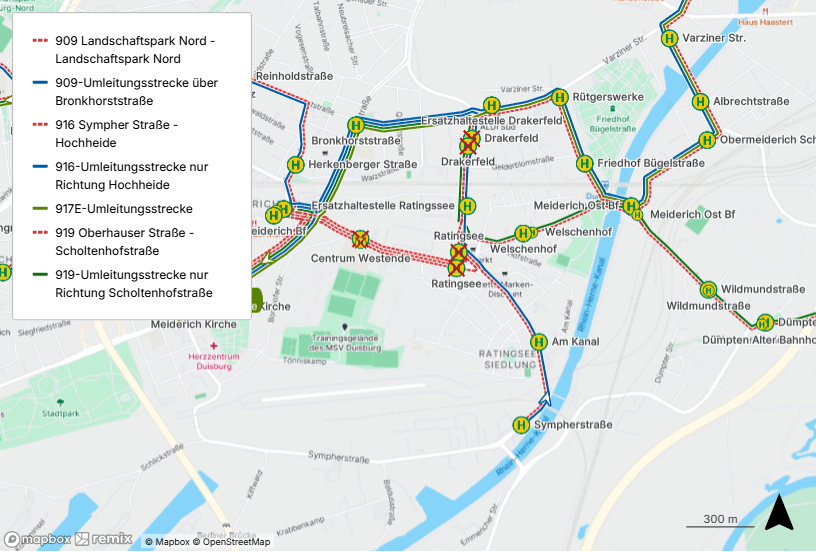 In Fahrtrichtung Scholtenhofstraße fahren die Busse ab der Haltestelle „Am Welschenhof“ eine örtliche Umleitung über die Emmericher Straße, Bronkhorststraße, Bahnhofstraße und Von der Mark Straße zum ZOB Meiderich. Ab da gilt der normale Linienweg. Die Haltestelle „Centrum Westende“ entfällt. Die DVG bittet die Fahrgäste die Haltestelle „Meiderich Bf.“ zu nutzen. Die Haltestelle „Ratingsee“ wird auf die Emmericher Straße hinter die Einmündung Am Welschenhof verlegt. Die Haltestelle „Drakerfeld“ wird auf die Varziner Straße in Höhe der Hausnummer 3 verlegt.