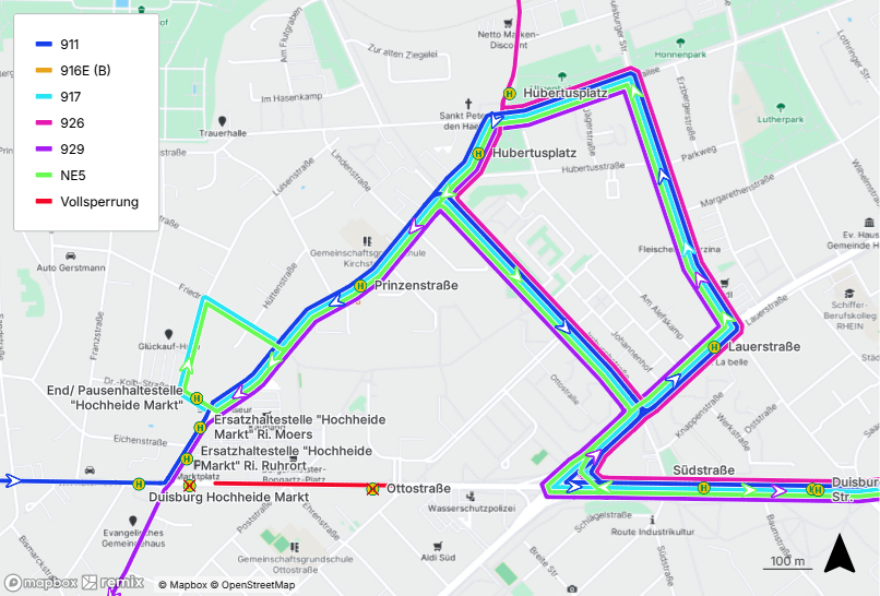 In Fahrtrichtung Sportpark fahren die Busse ab der Haltestelle „Hubertusplatz“ eine örtliche Umleitung über die Husemannstraße, Lauerstraße und Moerser Straße. Ab da gilt der normale Linienweg. Die Haltestellen „Ottostraße“ und „Hochheide Markt“ entfallen. Die DVG bittet die Fahrgäste die Haltestelle „Südstraße der Linien 911, 917 und 929 in Fahrtrichtung Hocheide zu nutzen.