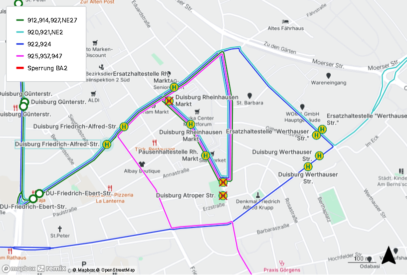In Fahrtrichtung Meiderich Bf. beziehungsweise Winkelhausen fahren die Busse ab der Haltestelle „Rheinhausenhalle“ eine örtliche Umleitung über die Kreuzung Schwarzenberger Straße/Margarethenstraße, Werthauser Straße und Duisburger Straße zur Ersatzhaltestelle „Rheinhausen Markt“. Ab da gilt der normale Linienweg. Die Haltestelle „Atroper Straße“ entfällt. Die DVG bittet die Fahrgäste die Ersatzhaltestelle „Rheinhausen Markt“ zu nutzen. Die Haltestelle „Rheinhausen Markt Bussteig 2“ wird auf die Duisburger Straße in Höhe der Hausnummer 7 verlegt.