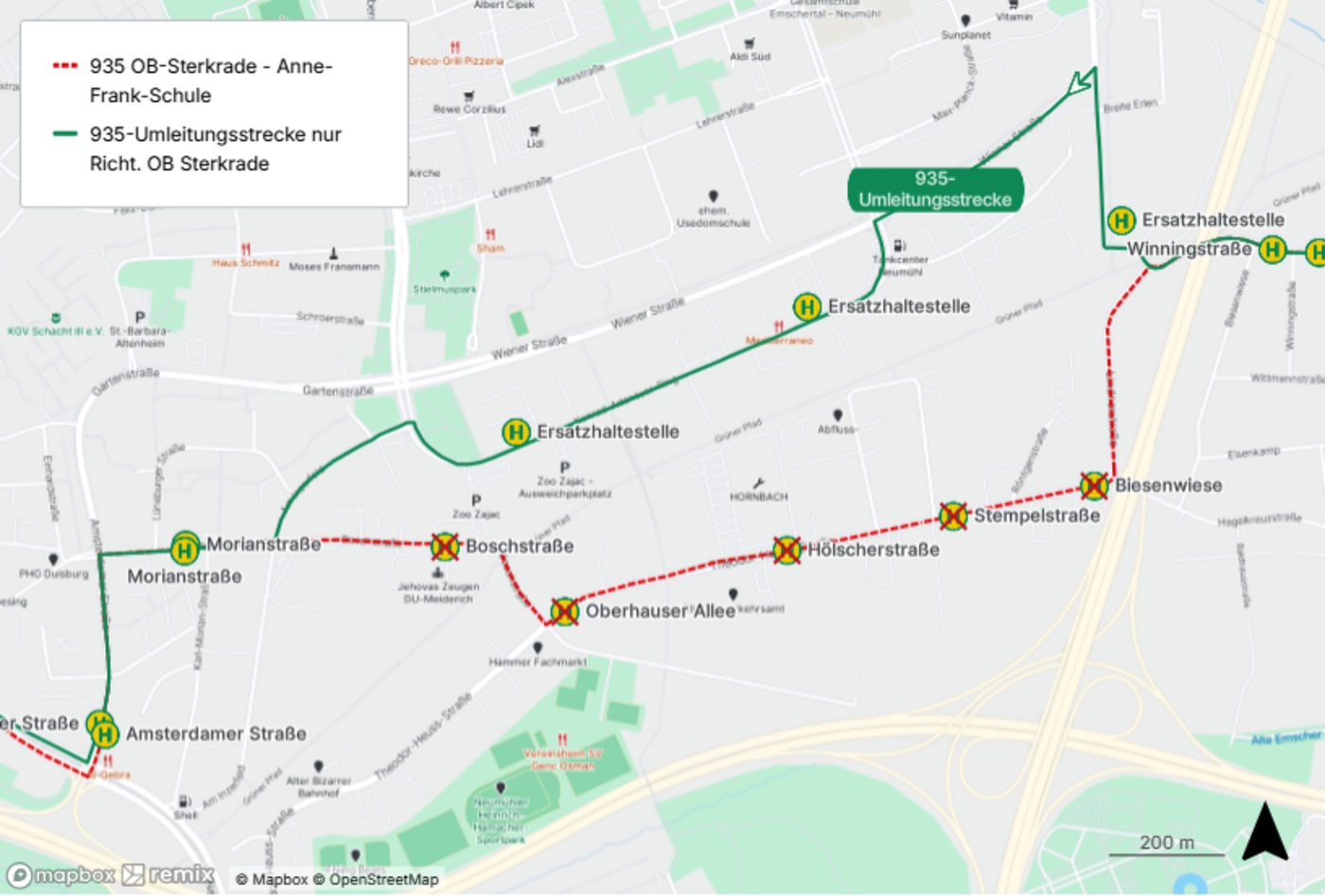 In Fahrtrichtung Sterkrade fahren die Busse ab der Haltestelle „Winnigstraße“ eine örtliche Umleitung über die Buschhauser Straße, Wiener Straße, Konrad-Adenauer-Ring, Am Inzerfeld und Sofienstraße. Ab da gilt der normale Linienweg. Die Haltestelle „Oberhauser Allee“ wird auf den Konrad-Adenauer Ring in Höhe der Hausnummer 6 verlegt. Die Haltestelle „Hölscherstraße“ wird auf den Konrad-Adenauer-Ring in Höhe der Hausnummer 13 verlegt. Die Haltestelle „Stempelstraße“ wird auf den Konrad-Adenauer-Ring vor die Einmündung Daimlerstraße verlegt. Die Haltestelle „Biesenwiese“ wird auf die Haldenstraße in Höhe der Einmündung Lindnerstraße verlegt.