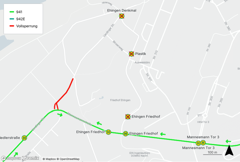Die Busse fahren in Fahrtrichtung Wolfssee beziehungsweise Mannesmann Tor 2 ab der Haltestelle „Siedlerstraße“ eine örtliche Umleitung über die Uerdinger Straße und Mannesmannstraße. Ab da gilt der normale Linienweg. Die Haltestellen „Ehingen Friedhof Bussteig 1“, „Plastik“ und „Ehingen Denkmal“ entfallen. Die DVG bittet die Fahrgäste die Haltestelle „Ehingen Friedhof“ auf der Mannesmannstraße zu nutzen.
