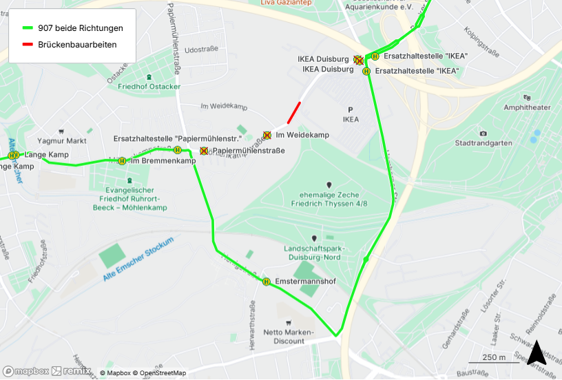 In Gegenrichtung wird die Umleitung sinngemäß gefahren. Die Haltestelle „IKEA“ wird auf die Hamborner Straße hinter die Kreuzung Hamborner Straße/Beecker Straße verlegt.